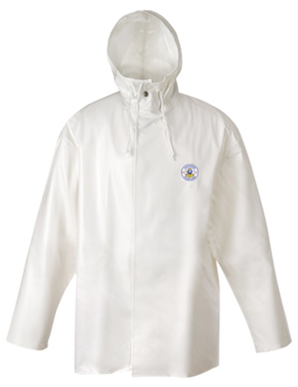 PVC belagt polyester 330 g/m2. Fett og kuldebestandig, glatt strikket bakside. Hidrer absorbasjon av batkterievann. Sydde og sveisede sømmer. Skjult knapping i front. Snorregulering i hette. Trykknapp i nedkant. Vaskes på 40 grader.
